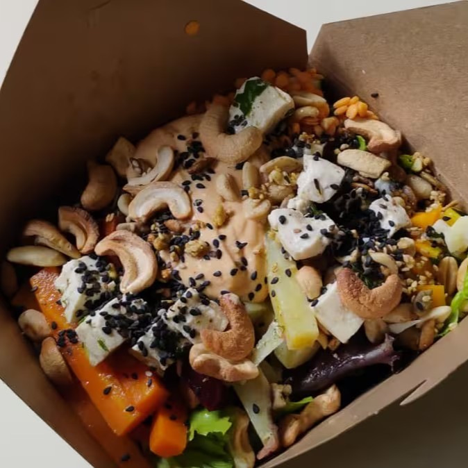 Combo Proteico: Salada proteica, mix de verduras orgânicas, leguminosas cruas e cozidas oleaginosas, castanhas e sementes torradas. Acompanhamento: Sobremesa Fit (Sem adição de açúcar) + suco natural!