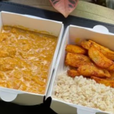 Estrogonofe de frango vegetal com pupunha, arroz integral orgânico e batata rústica. (vegano, contém glúten)
