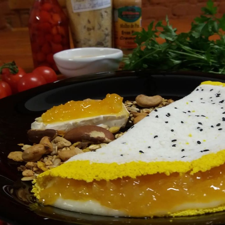 Tapioca recheada com mousse de queijos com queijo tipo brie e geleia de damasco caseira.