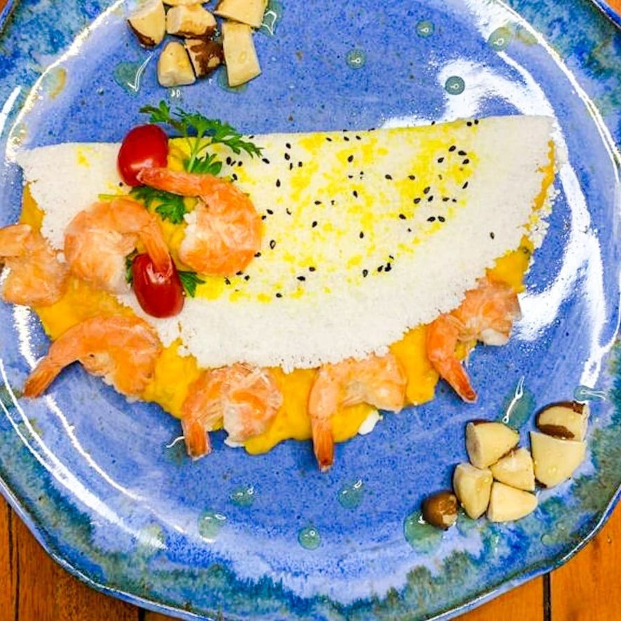 Tapioca recheada com camarões médios grelhados em deliciosa cama de vatapá.
