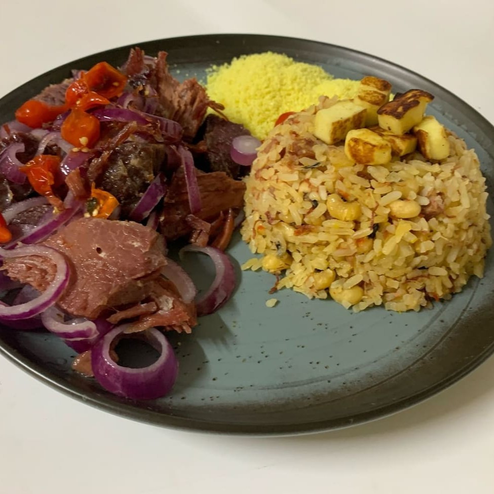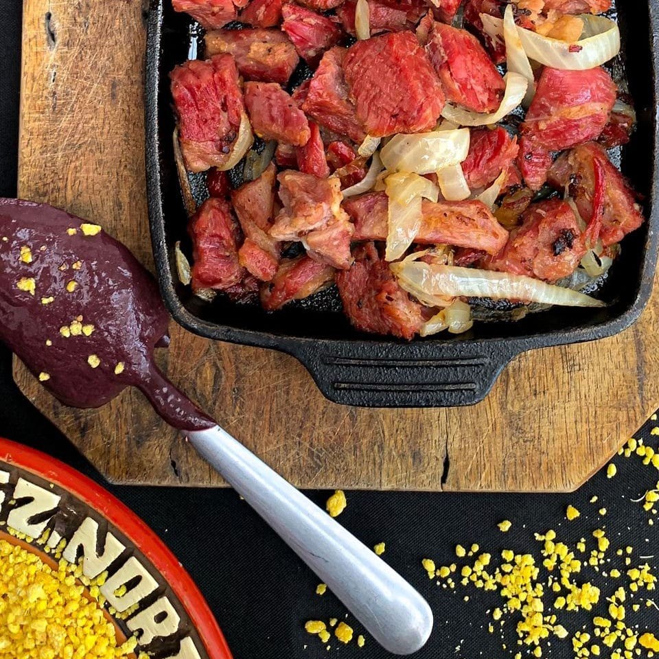 Delicie-se com o nosso Charque Frito com Açaí, uma verdadeira joia da culinária nortista. A suculência do charque cuidadosamente frito, com o toque aromático das cebolas roxas, harmoniza perfeitamente com o Açaí do Grosso, servido fresco e natural. Esta combinação celebra a autenticidade e os sabores vibrantes do norte brasileiro, fazendo deste prato uma experiência gastronômica inesquecível. Uma delícia de dar água na boca que vai te transportar para a rica e diversificada culinária do norte do país.