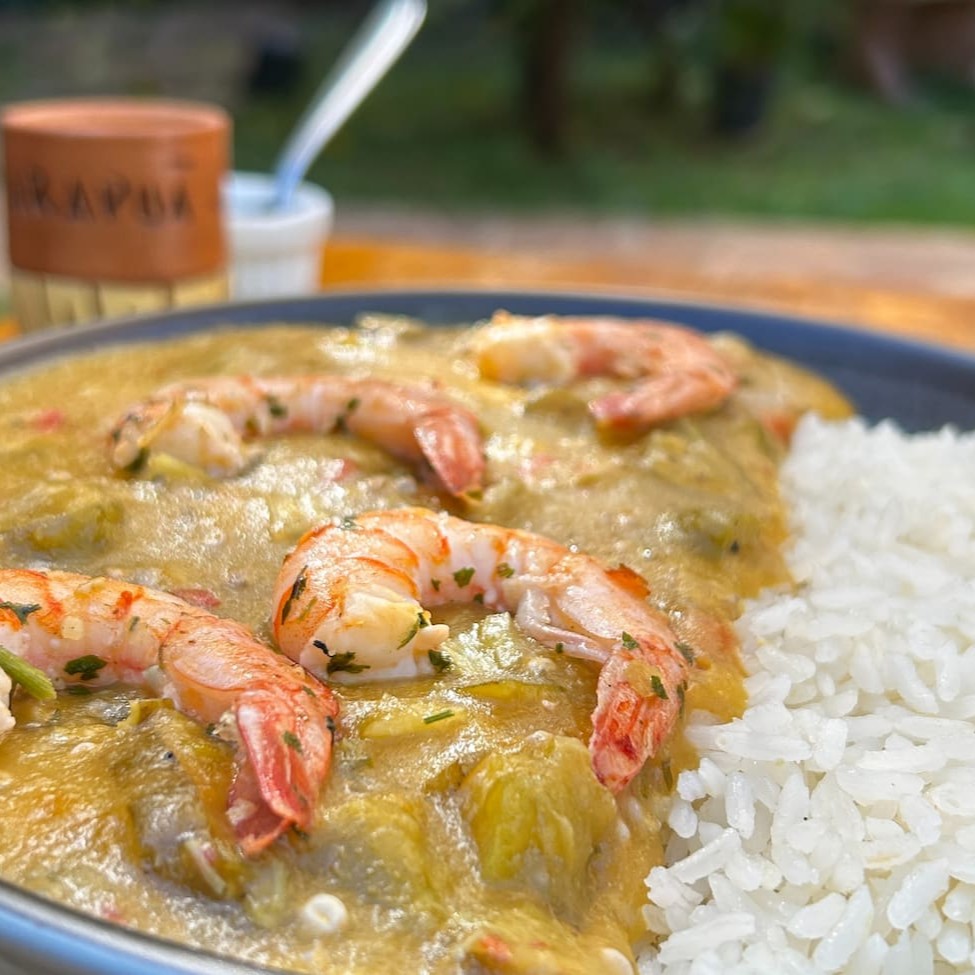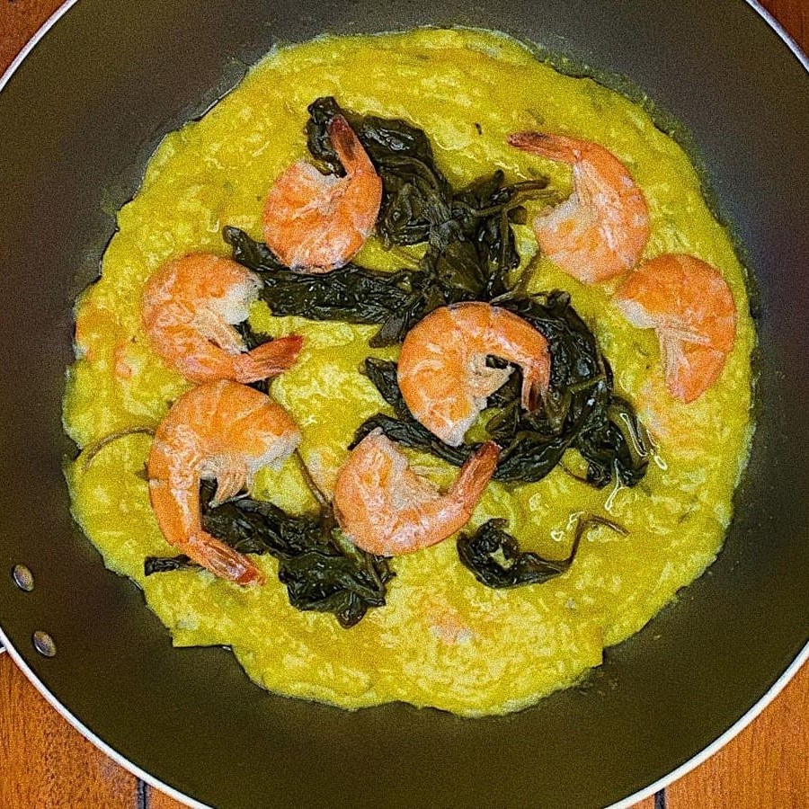 Vatapá típico do Pará. Creme de camarões com leite de coco e azeite de dendê com Camarões médios grelhados.