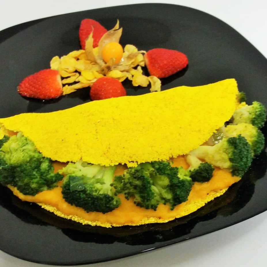 Tapioca branca recheada com legumes de estação refogados sobre uma cama de kabotchan. Na tapioca da foto usamos açafrão da terra como corante natural (naturalíssimo). Há opção para colorir sua tapioca.