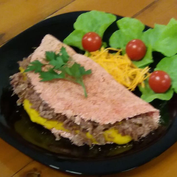 Carne seca desfiadinha com creme de abóbora. Kabotchan. A tapioca da foto, cor de rosa, foi feita uma cliente especial tendo sido utilizada beterraba como corante natural (natural, de verdade)