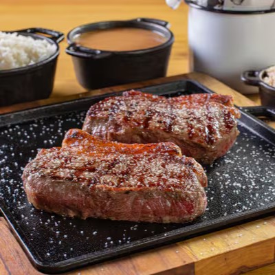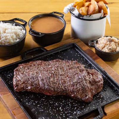 São 500g(in natura) de Bife Chorizo, acompanhado com Arroz, Feijão, Farofa e Batata Rústica. Apresenta muito sabor!