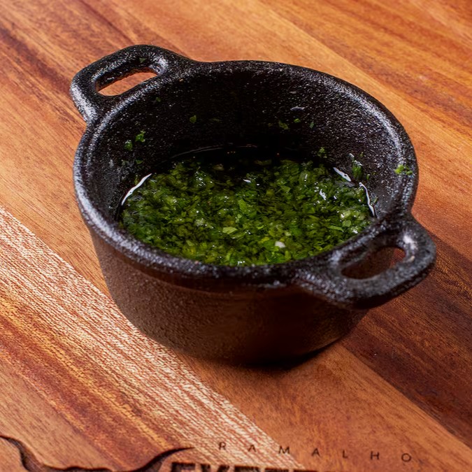 Molho autêntico de Chimichurri elaborado com salmoura com salsinha, dedo de moça, azeite e vinagre de maçã.