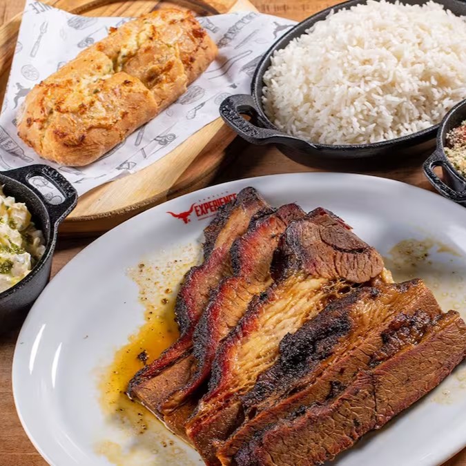 São 500g prontos de nosso autêntico Brisket, 150g de arroz branco, 120g de feijao e 1 pão de alho artesanal feito com ciabatta de fermentação natural.