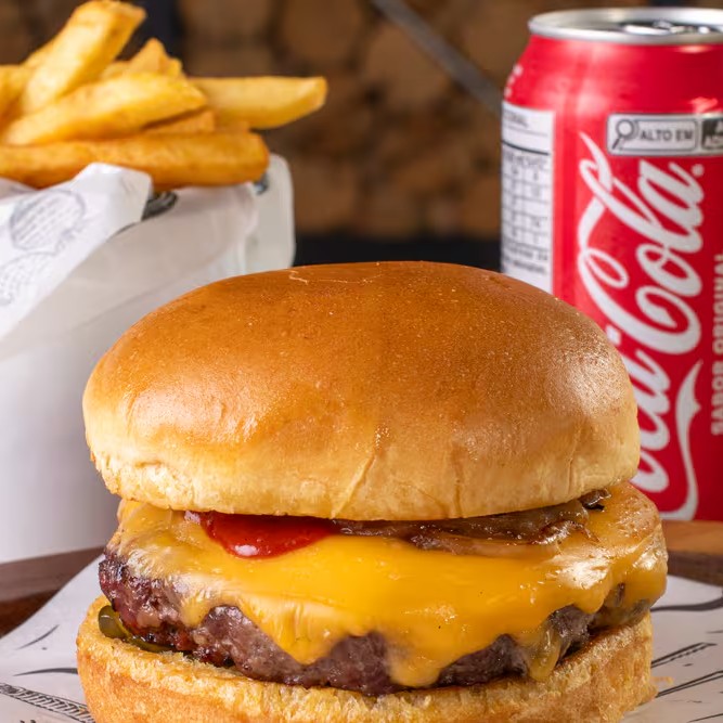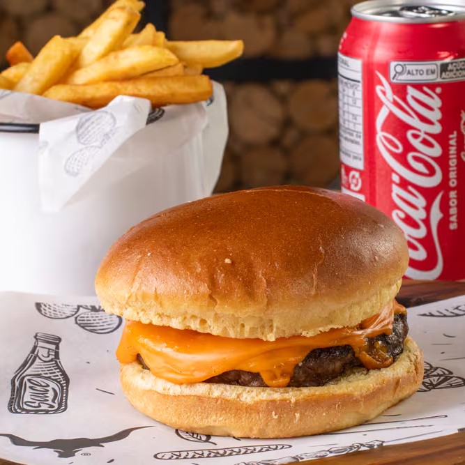 Simples e delicioso! Pão Brioche, 160g de burger Angus, queijo cheddar e maionese da casa. Acompanha fritas e refri!