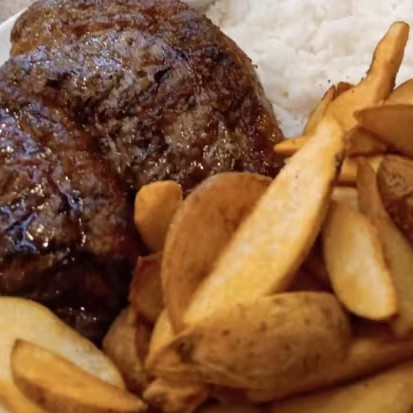 São 500g(in natura) de Bife Ancho, acompanhado com Arroz, Feijão, Farofa e Batatas rusticas. Perfeito para dividir.