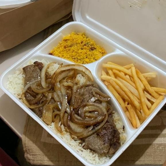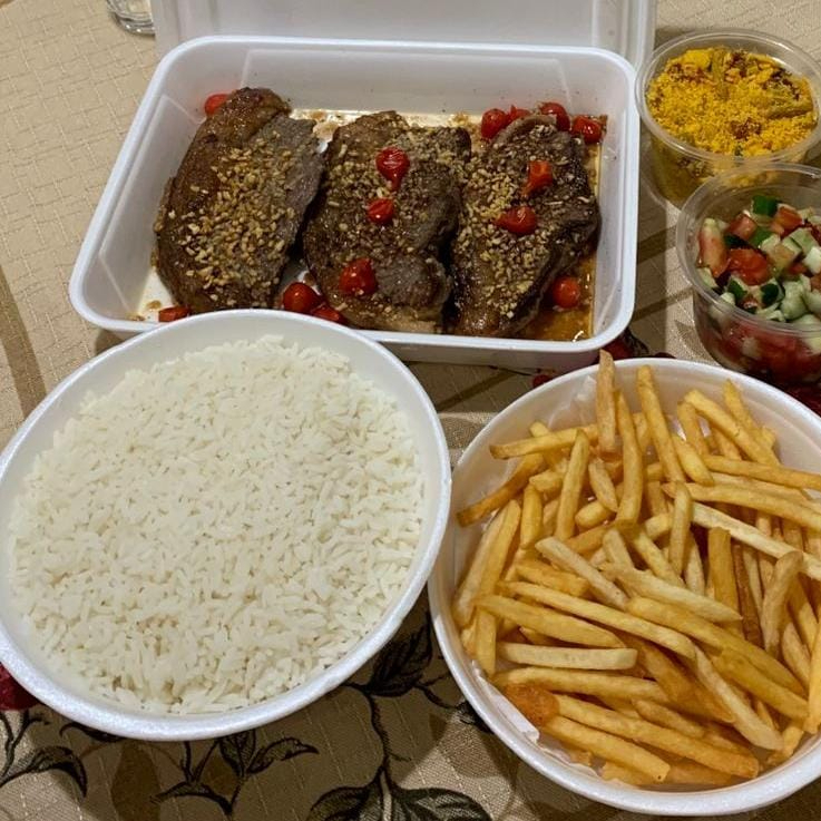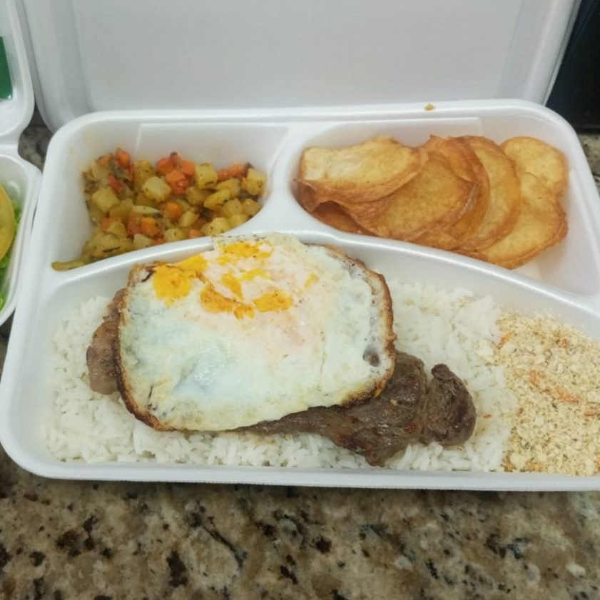EXECUTIVA MEDIA DE BIFE A CAVALO ACOMPANHA ARROZ , FEIJÃO , FRITAS , LEGUMES DO DIA E FAROFA.