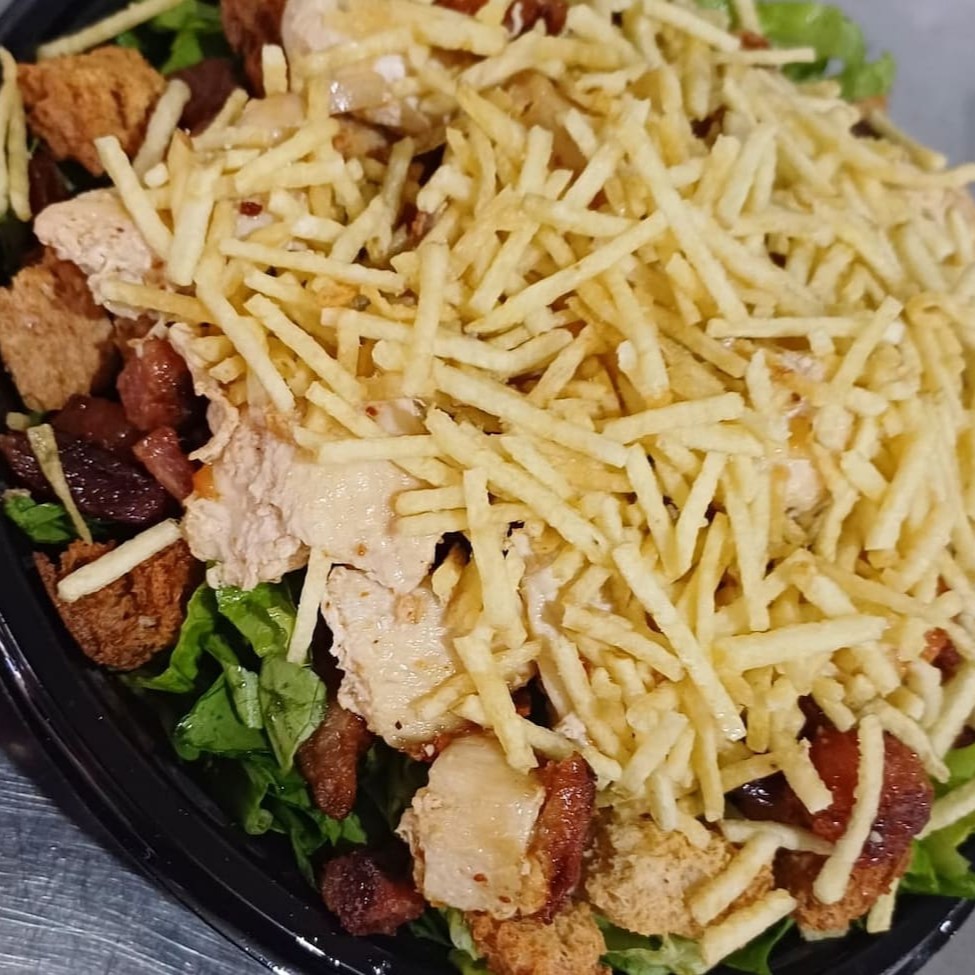 Mix de folhas, Cenoura Ralada, Batata palha, Bacon, Croutons, e + 01 proteína ( Frango ou Omelete ) Acompanha molho de alho.