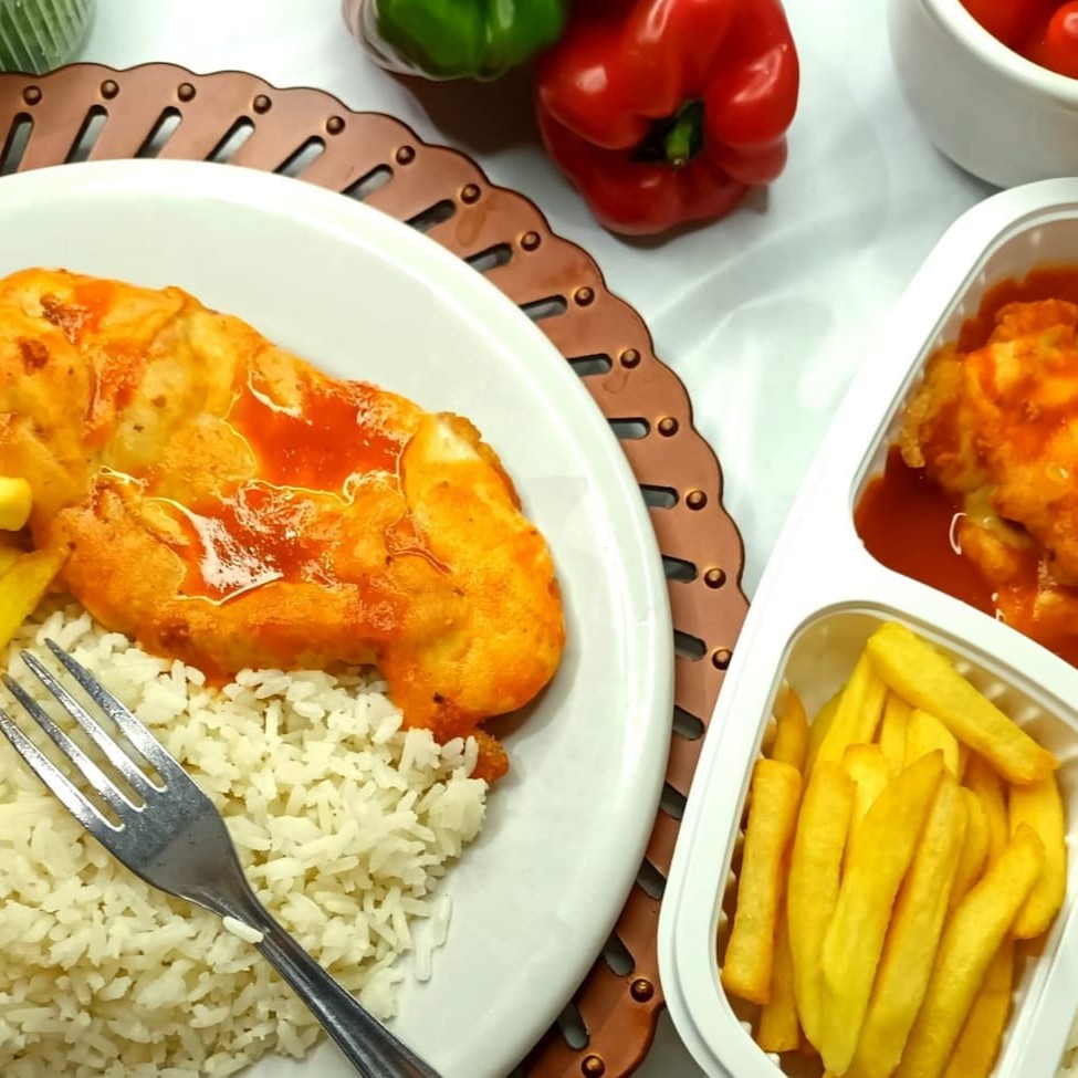 Arroz soltinho, Batata frita crocante e parmegiana de tilápia delicioso! Marmitex Média padrão de isopor