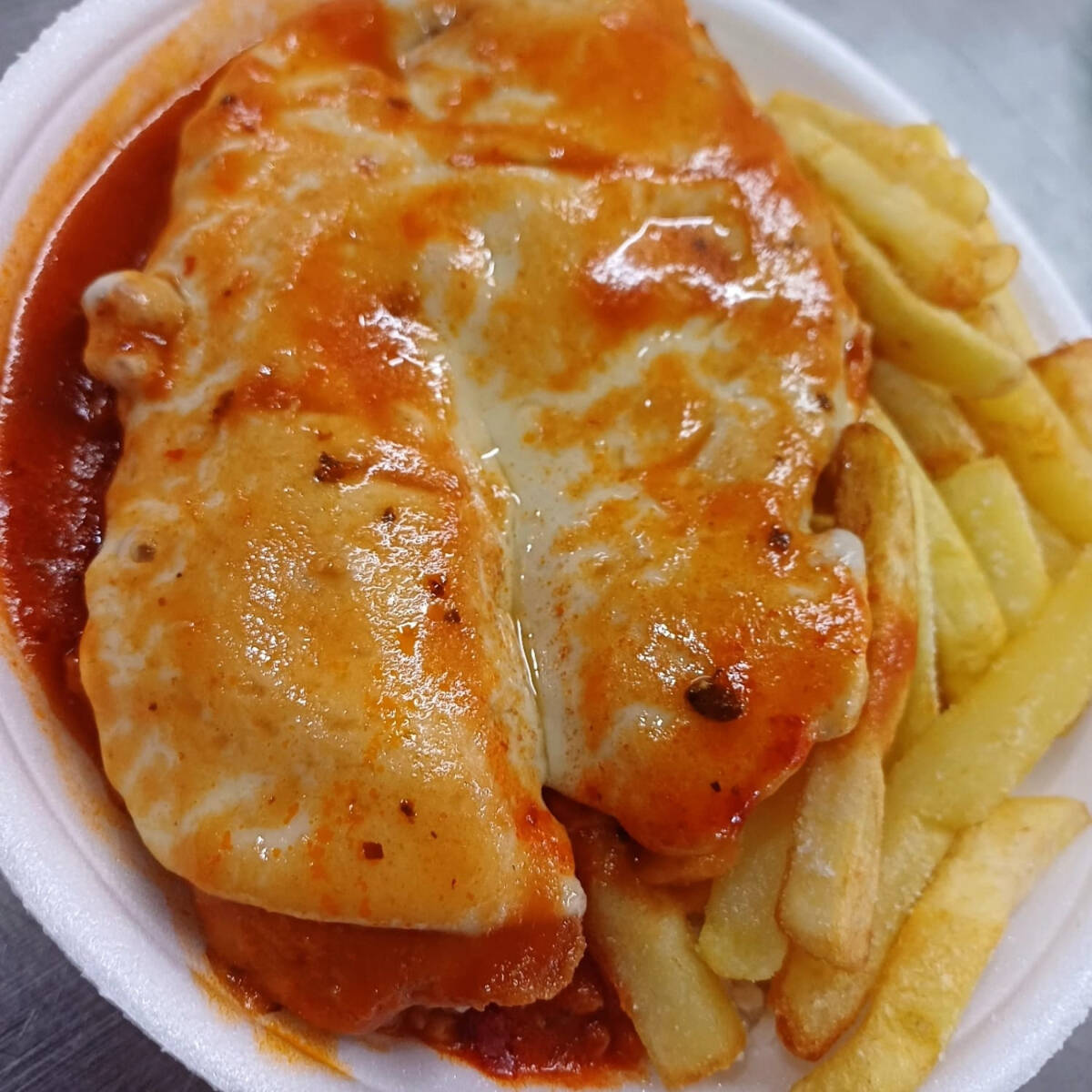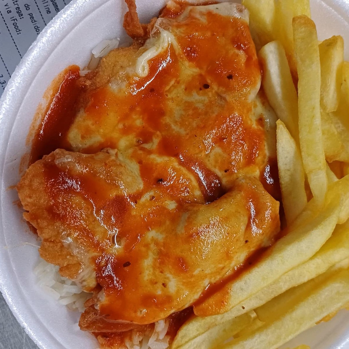Arroz soltinho, batata frita, parmegiana de carne com muito queijo! Combinação perfeita Marmitex de isopor redonda tamanho Médio