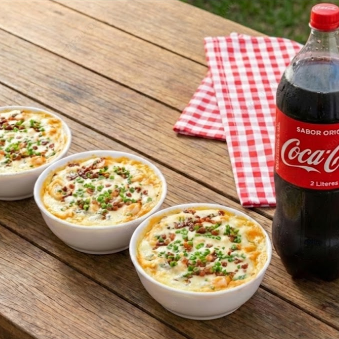 3 Batatas Recheadas 300ml Strogonoff + Coca-cola 2l