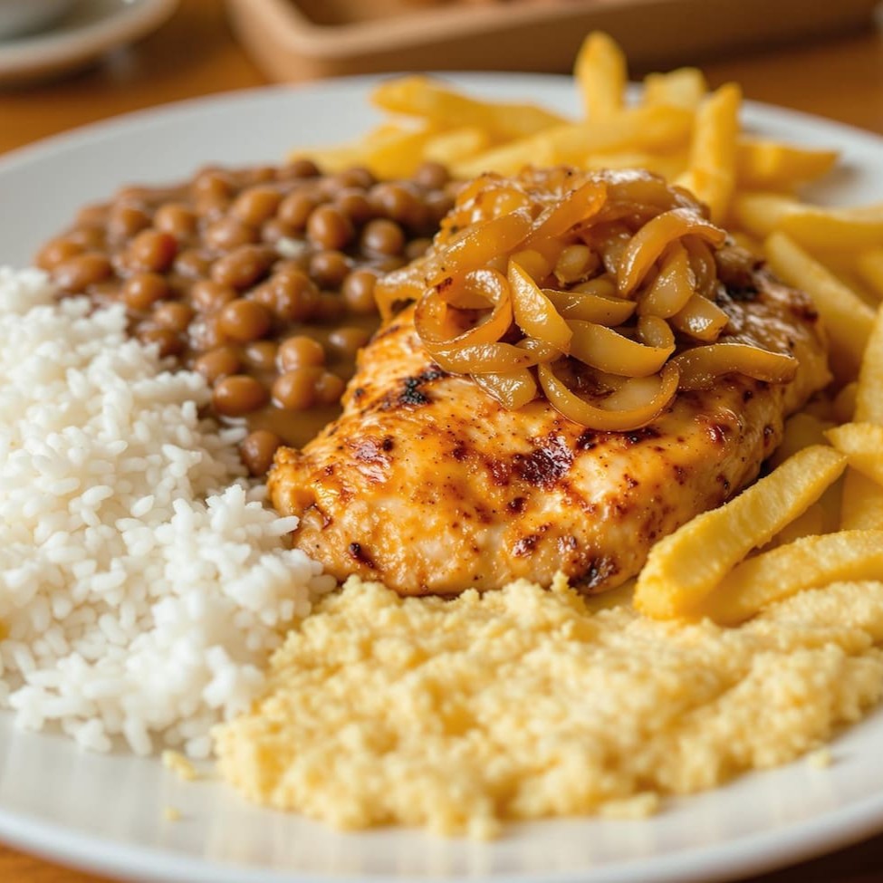 Clássico e completo: filé de frango grelhado, arroz soltinho, feijão bem temperado, farofa crocante e batatas fritas douradas. Um almoço pra chamar de seu.
