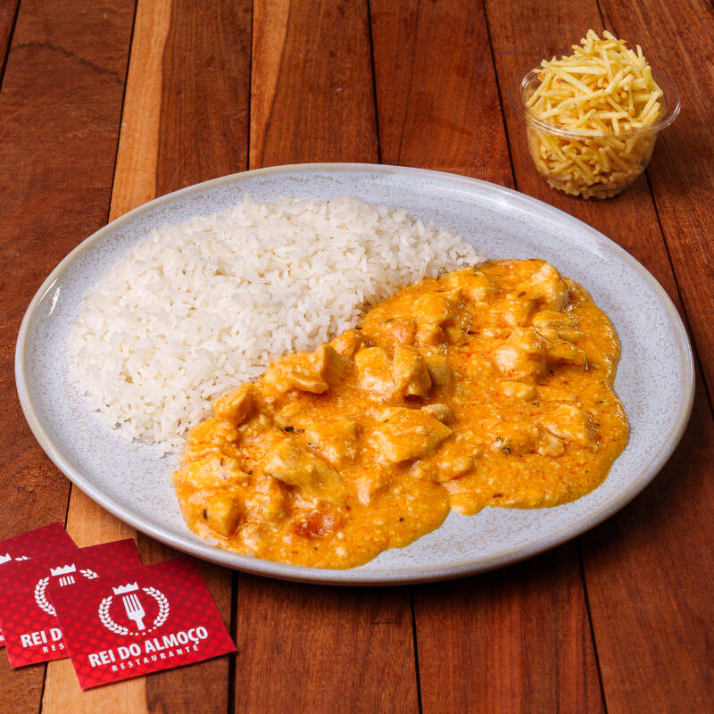 O strogonoff do Chef: frango suculento no creme clássico, com arroz soltinho e batata palha crocante. Sabor que conforta e conquista.