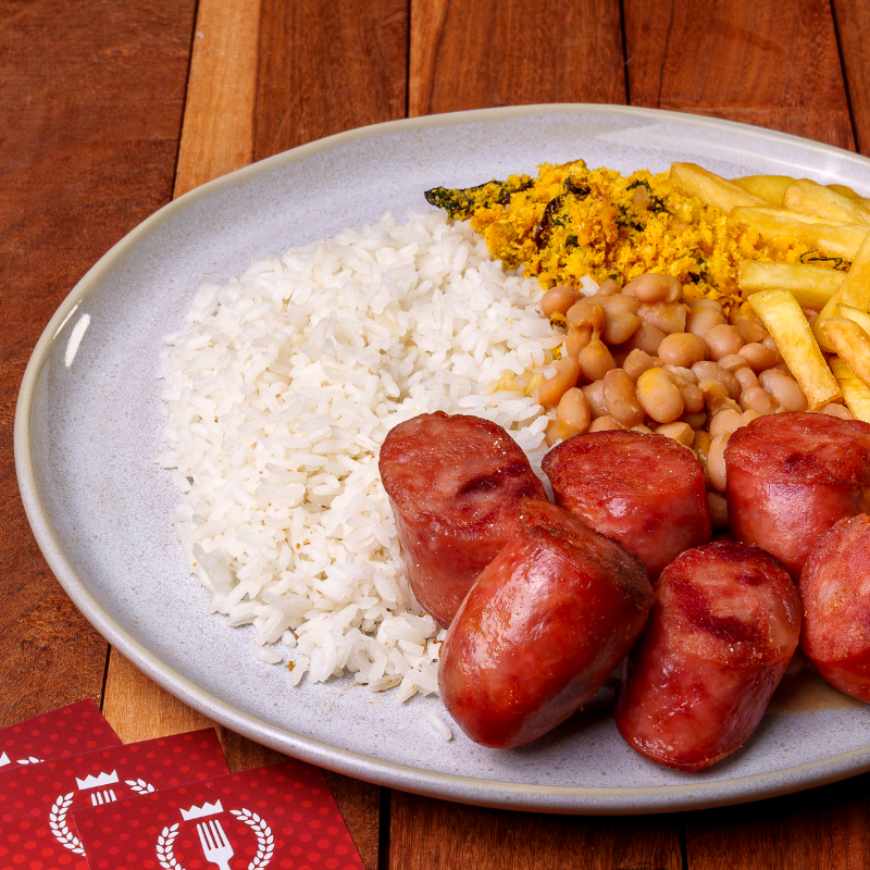 Do Chef: linguiça de pernil frita no ponto certo, com arroz soltinho, feijão bem temperado, farofa especial e batata frita crocante. Simples, intenso e delicioso.