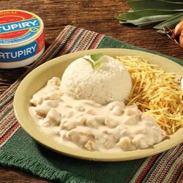 Nosso delicioso arroz branco soltinho, strogonoff de frango cremoso envolvido no Catupiry e batata palha