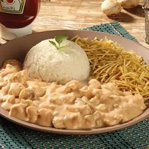 Nosso delicioso strogonoff de frango cremoso feito na casa diariamente, acompanha arroz branco soltinho e batata palha.