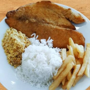 Acompanhamentos: arroz e batata frita.