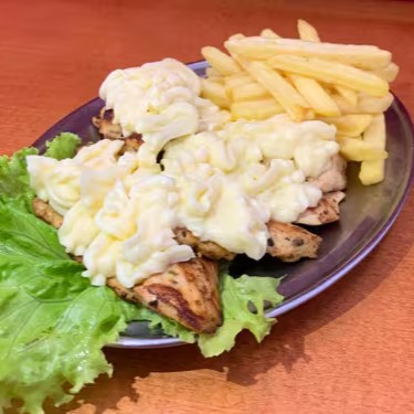 150g de Filé de Frango à milanesa coberto com fatias de presunto, mussarela, molho de tomate fresco e finalizado com parmesão.