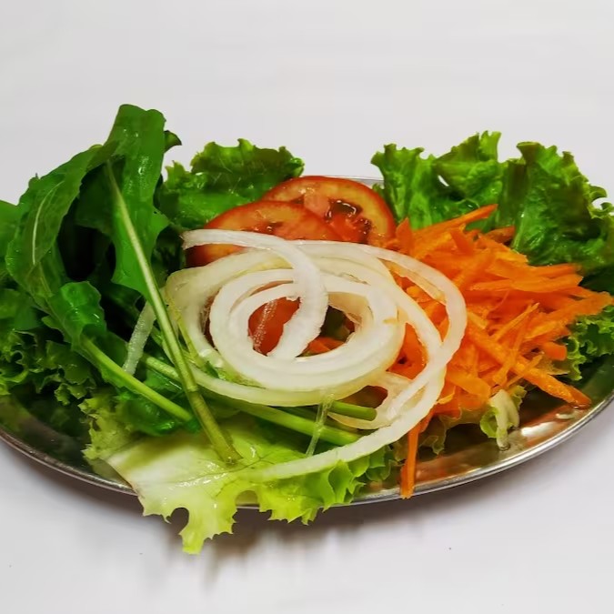 Salada simples composta por folhas de alface, rúcula, rodelas de tomate, cenoura e cebola.