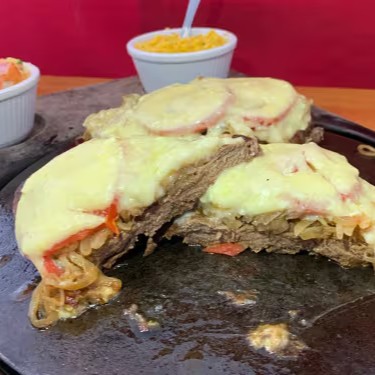 Filé Mignon suculento coberto com cebola, fatias de tomate e mussarela.