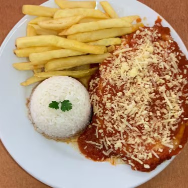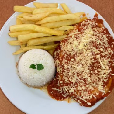 150g de Filé Mignon à milanesa coberto com fatias de presunto, mussarela, molho de tomate fresco e finalizado com parmesão.