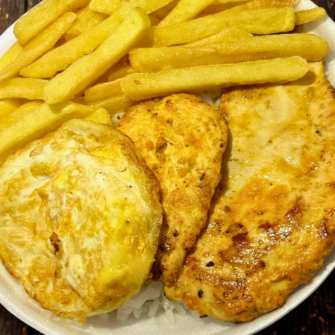 Arroz, feijão, frango grelhado, ovo frito e batata frita.