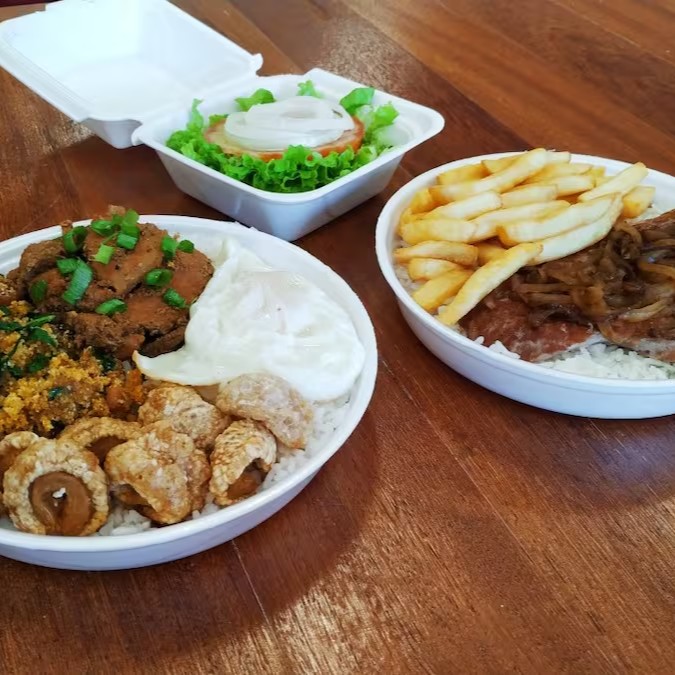 Acompanhamentos: salada, arroz, feijão, farofa, vinagrete e batata frita.