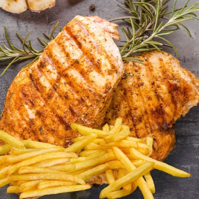 Filé de frango, arroz, feijão, batata frita de sorriso ou palito