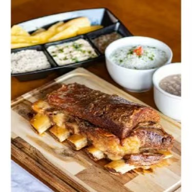 Acompanha arroz, feijão, mandioca cozida, maionese, vinagrete e nossa costela preparada em torno de 15 horas no bafo. (Não pode trocar acompanhamentos.)