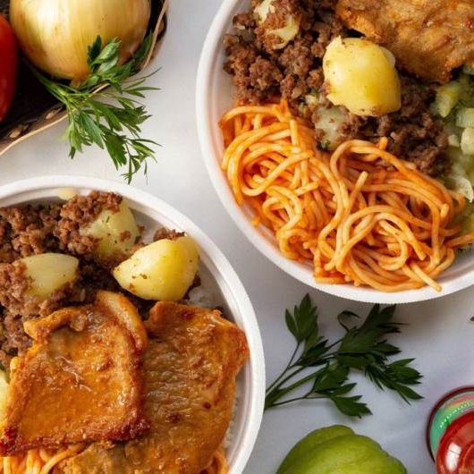 Arroz, feijão, batata frita, legumes do dia e 2 misturas. Caso deseje remover algum item, solicite em observações.