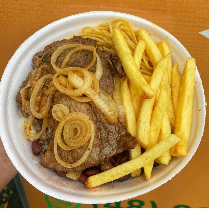 Arroz, feijão, batata frita, legumes do dia e bife acebolado. Marmitex média.