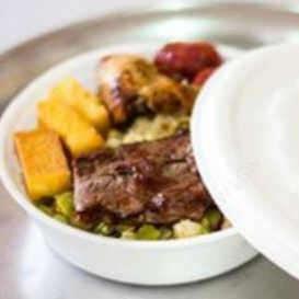 Arroz, feijão (opcional), batata frita, legumes do dia e filé de frango grelhado. Marmitex média.