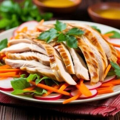Salada deliciosa com alface tomate cebola roxa tiras de frango grelhado ️