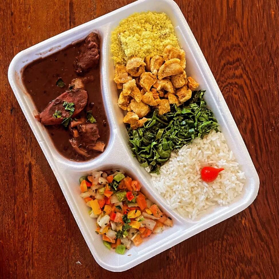 Acompanha: Arroz, feijoada, couve, torresmo, farofa da casa e vinagrete.
