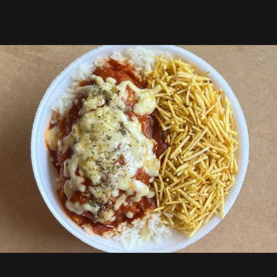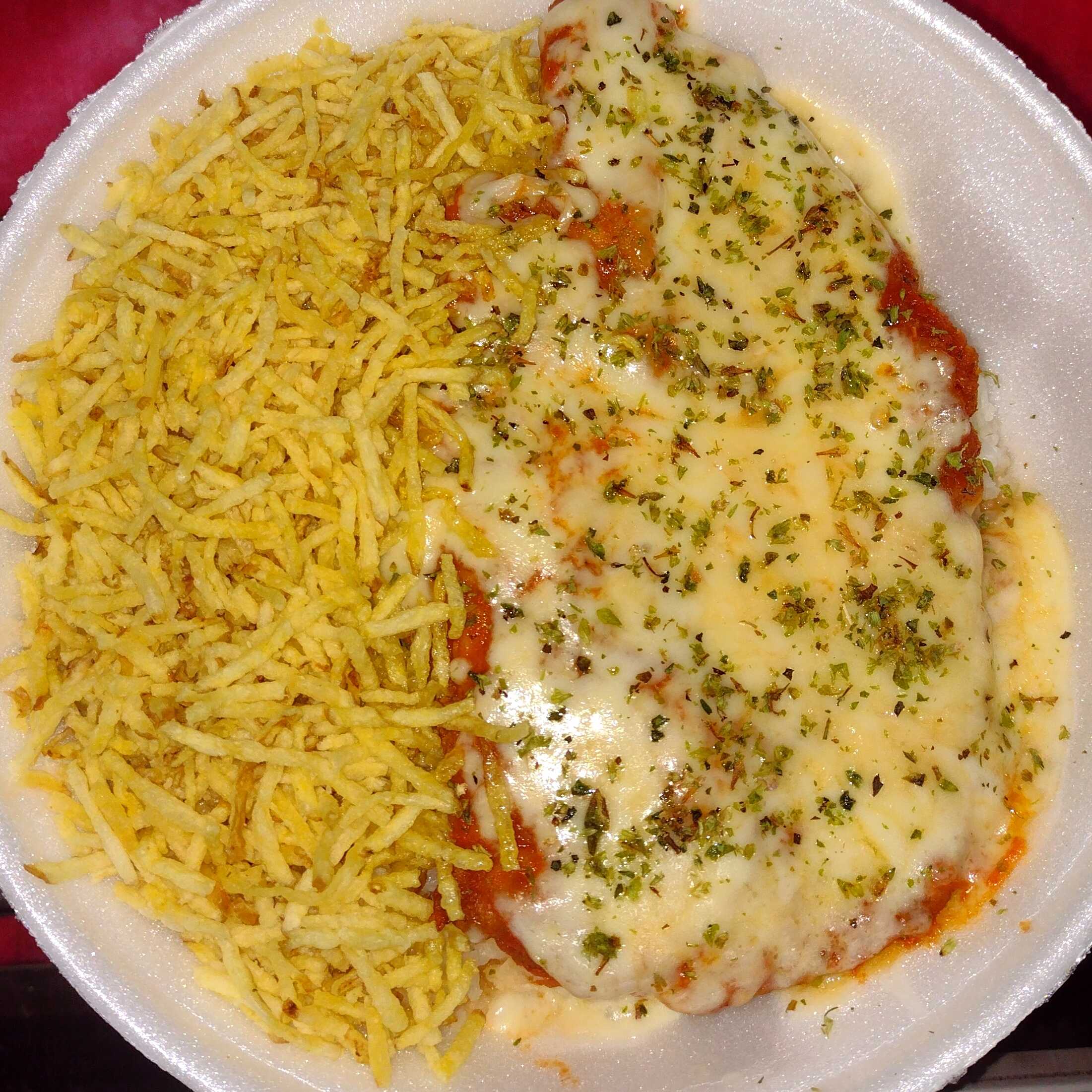 Parmegiana com Batata Palha e arroz .Serve Bem 1 pessoa Aprox 500gr