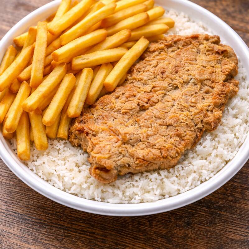 Filé de Frango Empanado crocante com Batata Palha e arroz .Serve Bem 1 pessoa Aprox 500gr