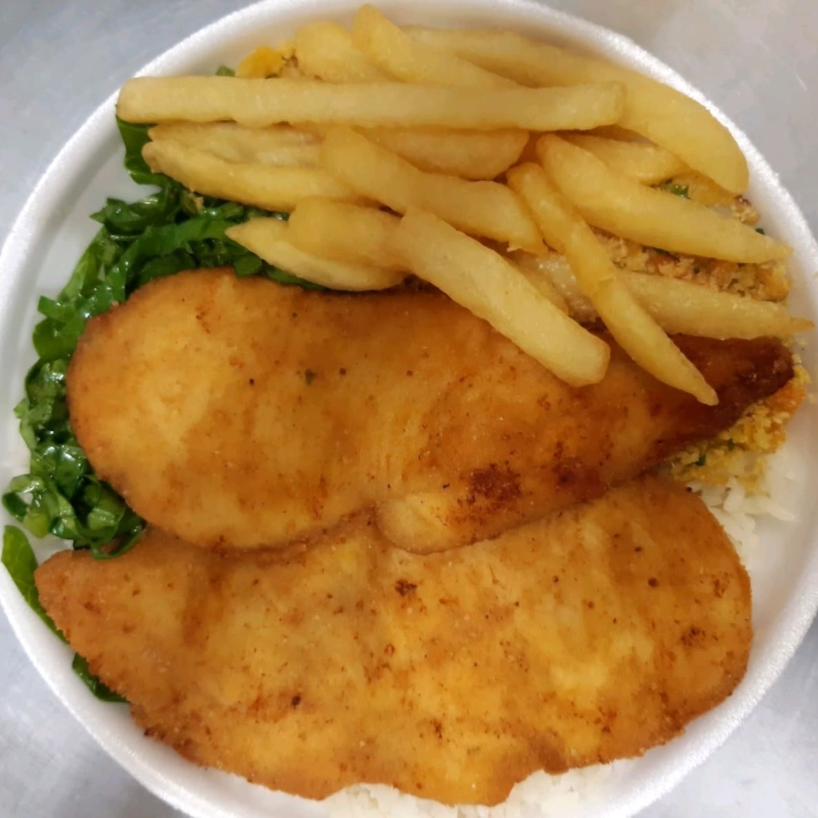 Selecionamos peitos de frango macios e sem osso, que são temperados com alho e especiarias. O segredo está no nosso empanado: o frango é cuidadosamente envolvido em uma farinha de rosca especial e frito rapidamente para garantir uma crosta dourada, sequinha e extremamente crocante, enquanto a carne por dentro se mantém incrivelmente suculenta.