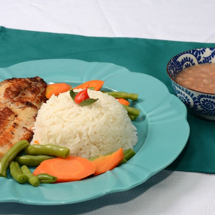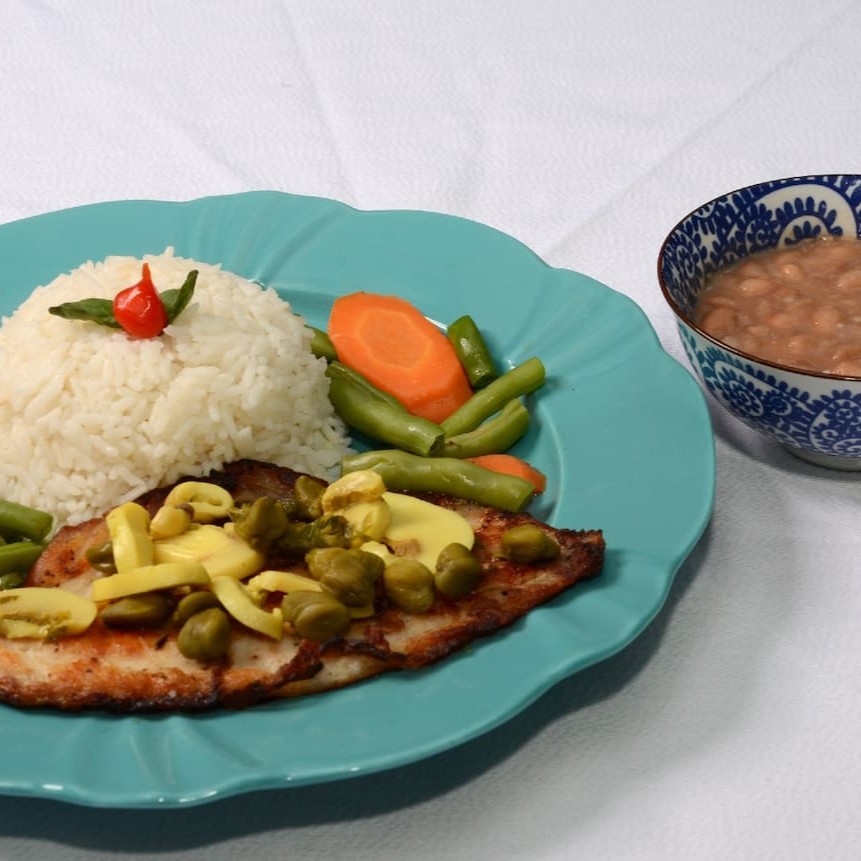 Acompanha arroz, legumes salteados e feijão