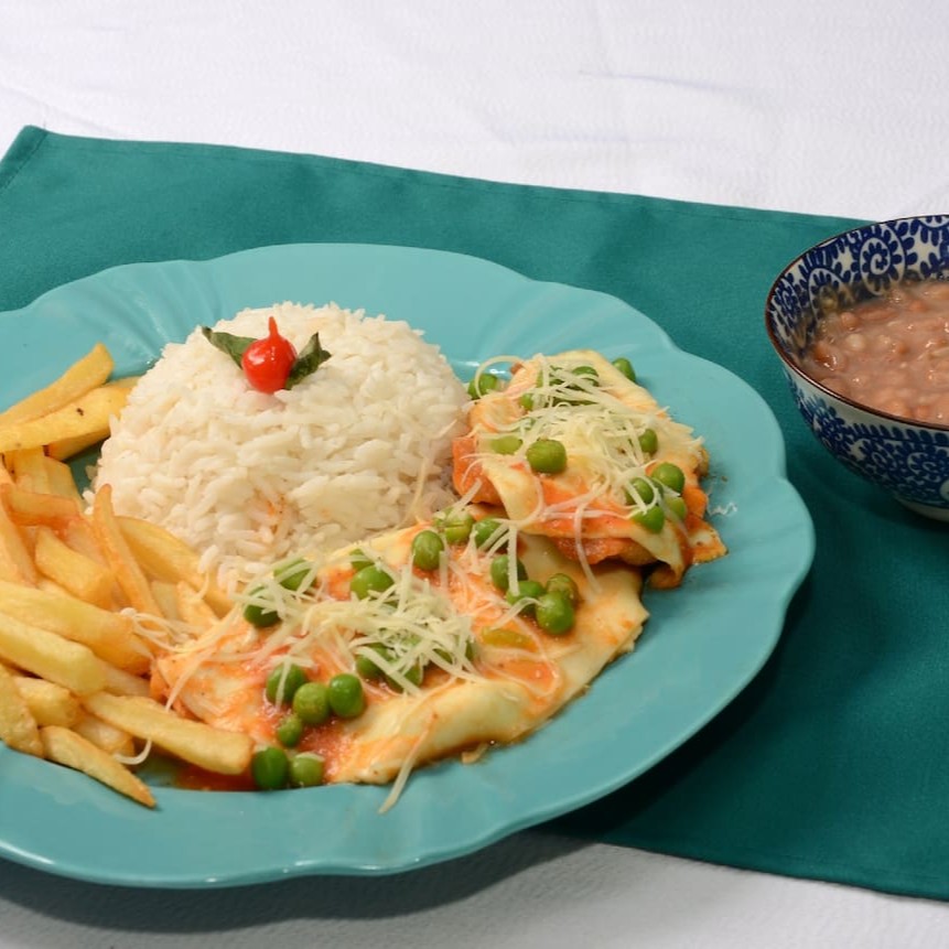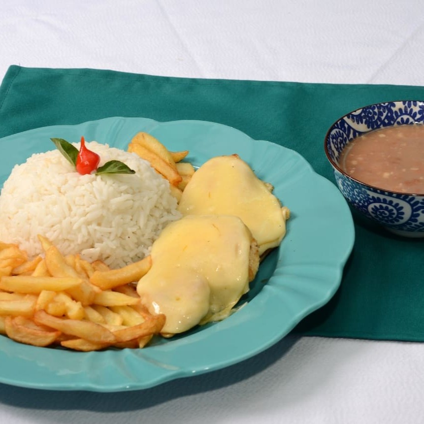 Filé de frango grelhado coberto com queijo provolone. Acompanha arroz, feijão, fritas e farofa