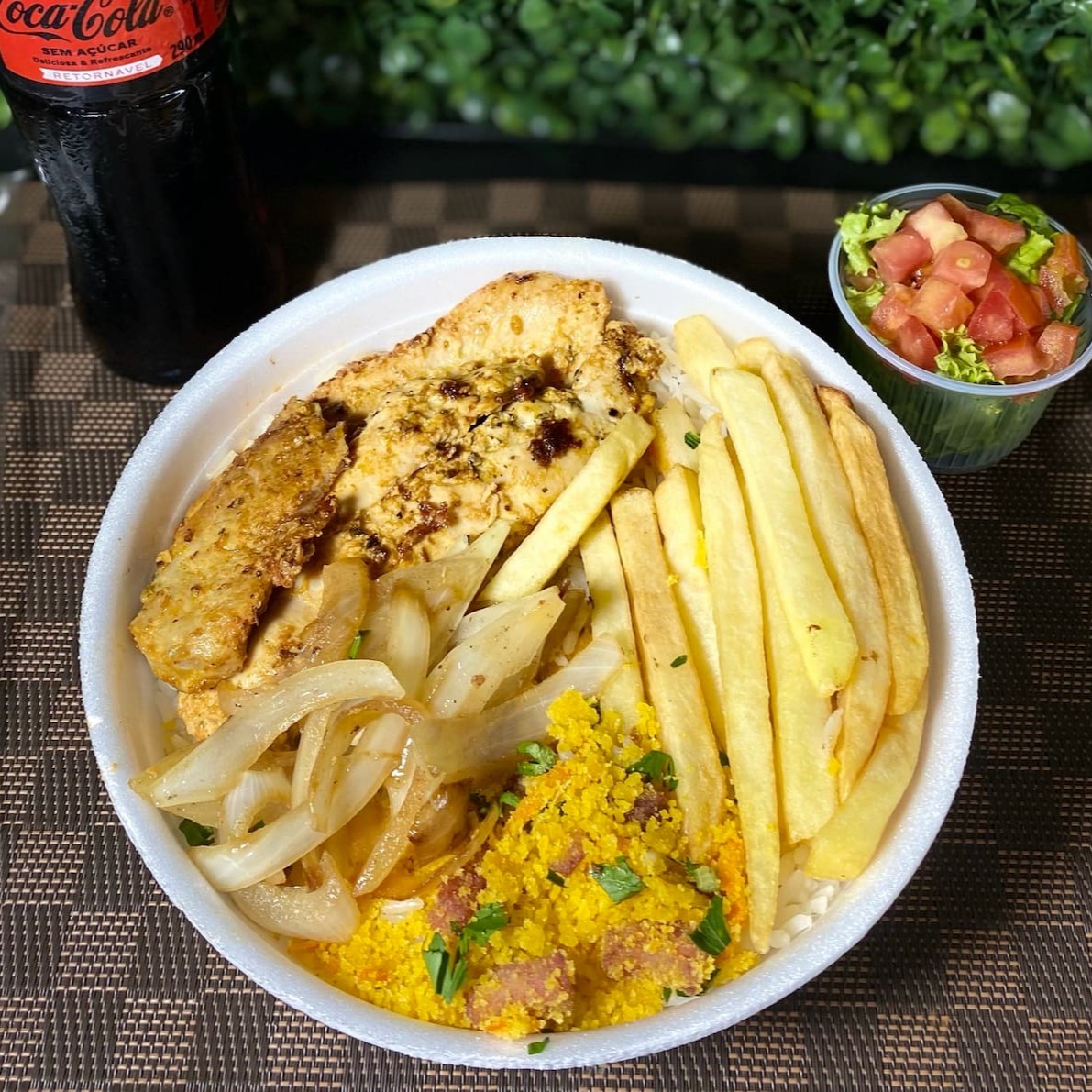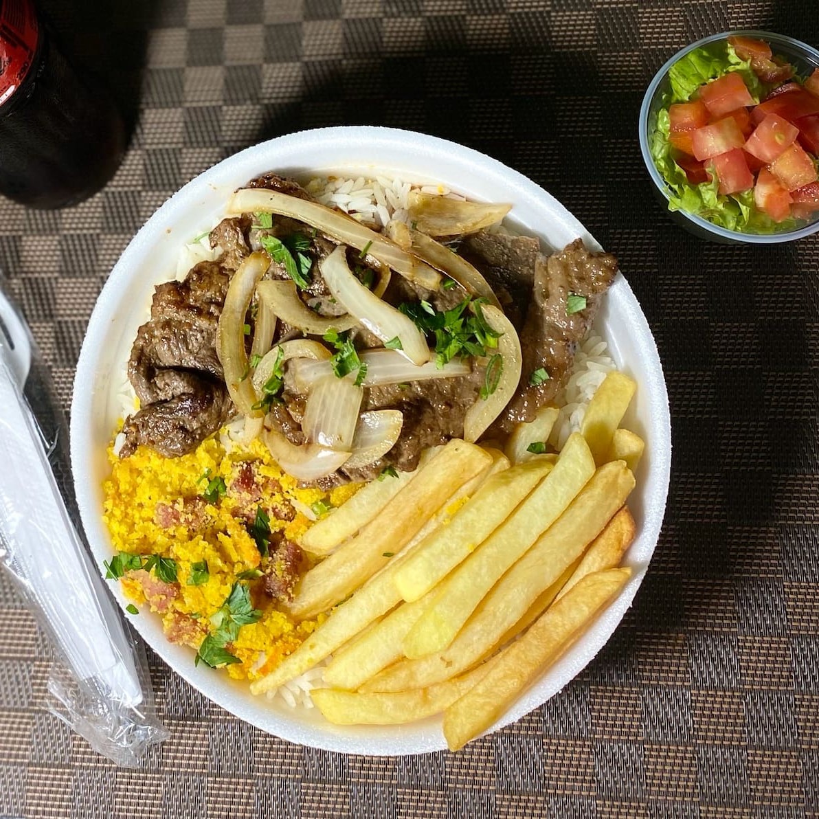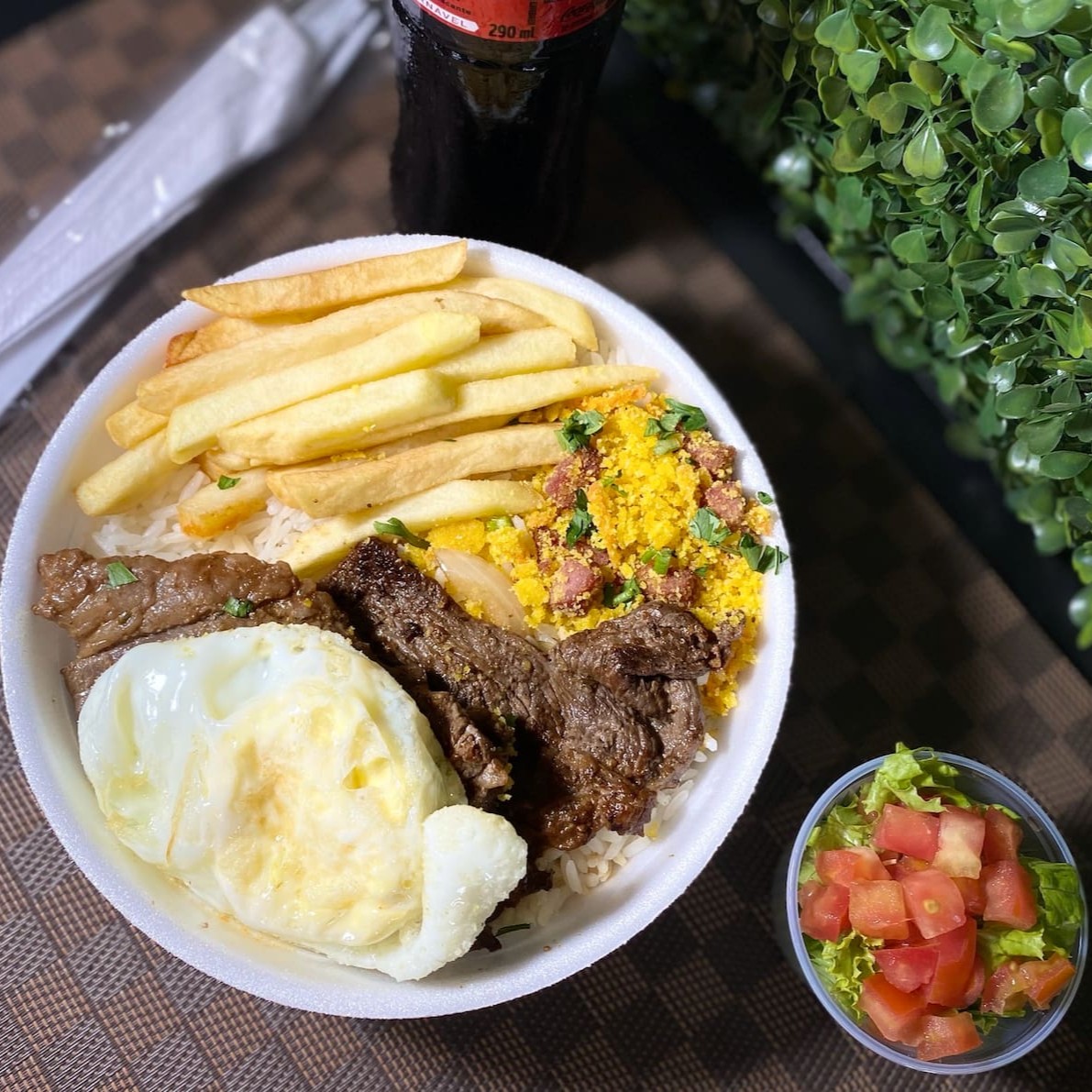Acompanha arroz, feijão, batata frita, ovo frito, farofa (opcional) + salada do Dia (vai separado).
