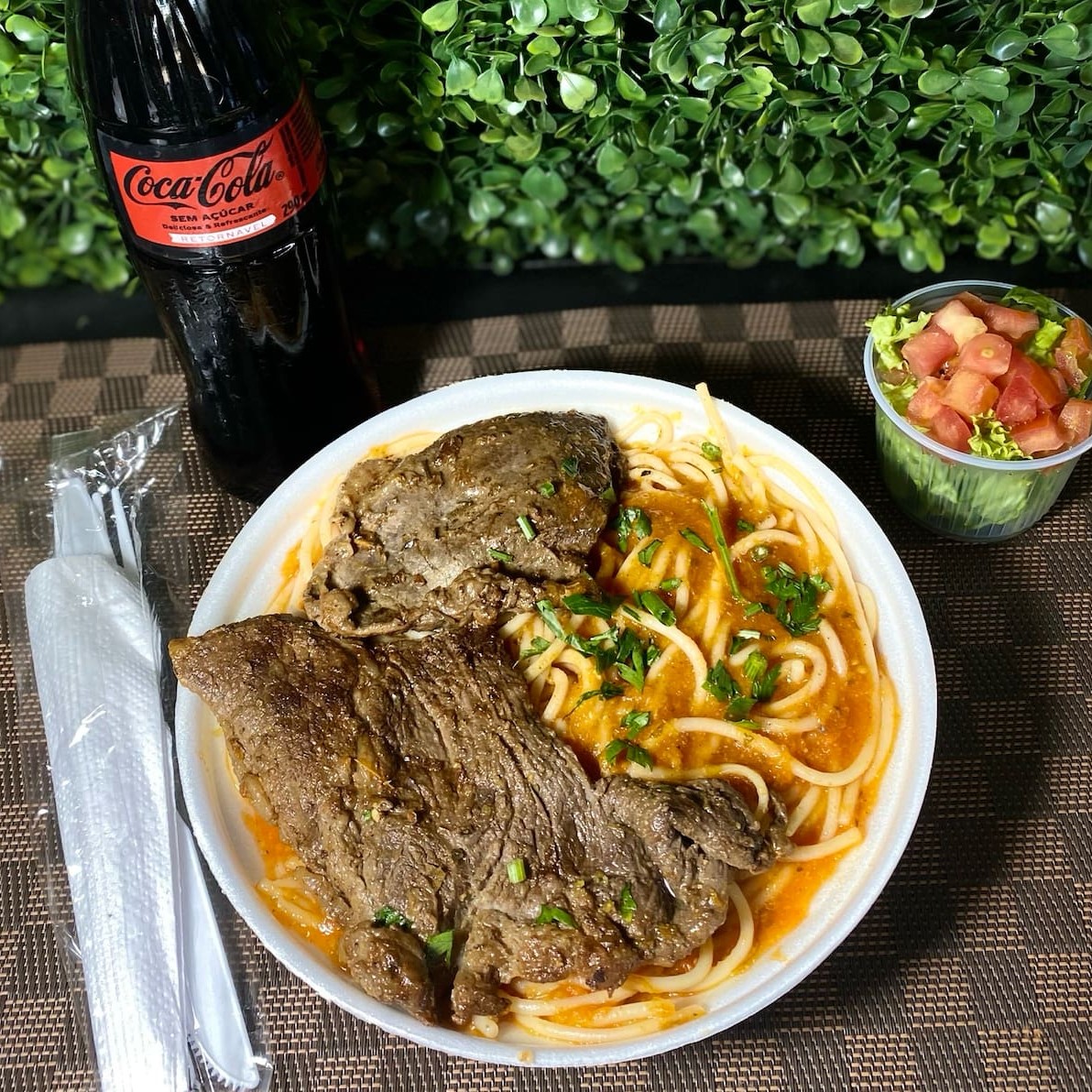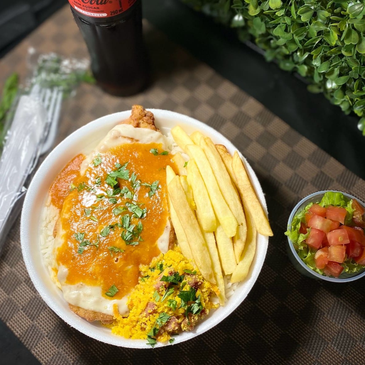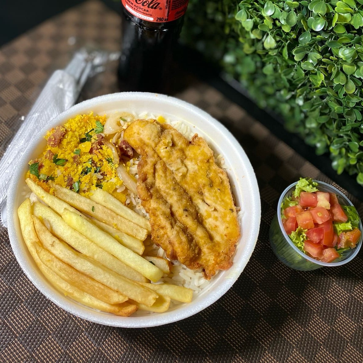 Acompanha arroz, feijão, batata frita, ovo frito, farofa (opcional) + salada do Dia (vai separado).