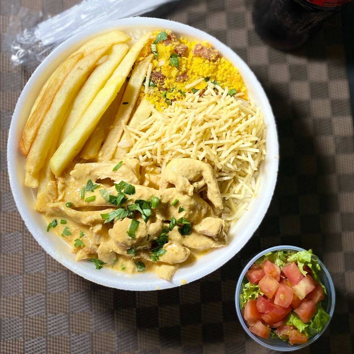 Acompanha arroz, feijão, batata frita, farofa (opcional), batata palha + salada do Dia (vai separado).