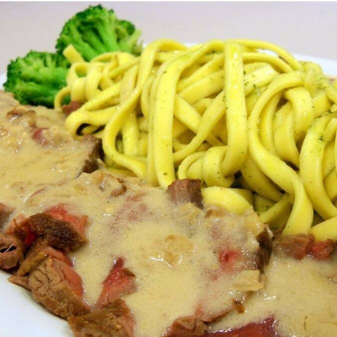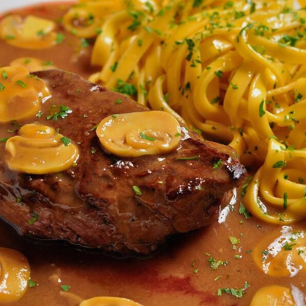 Medalhão ao molho madeira com champignons. Acompanha tagliarini na manteiga