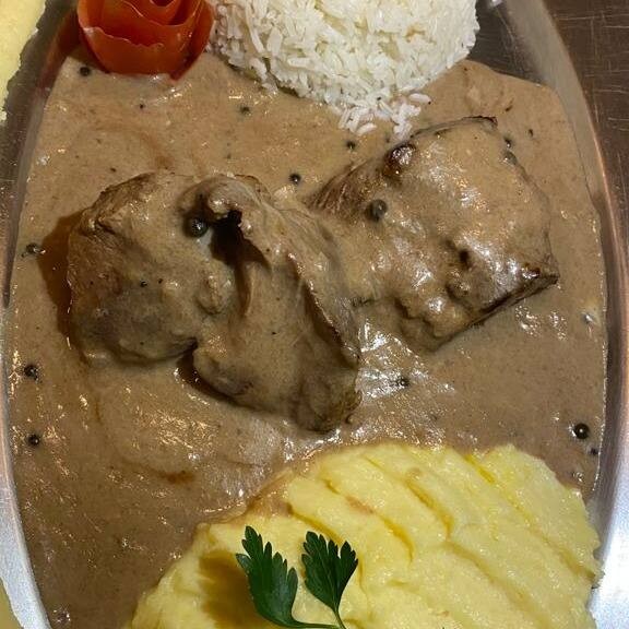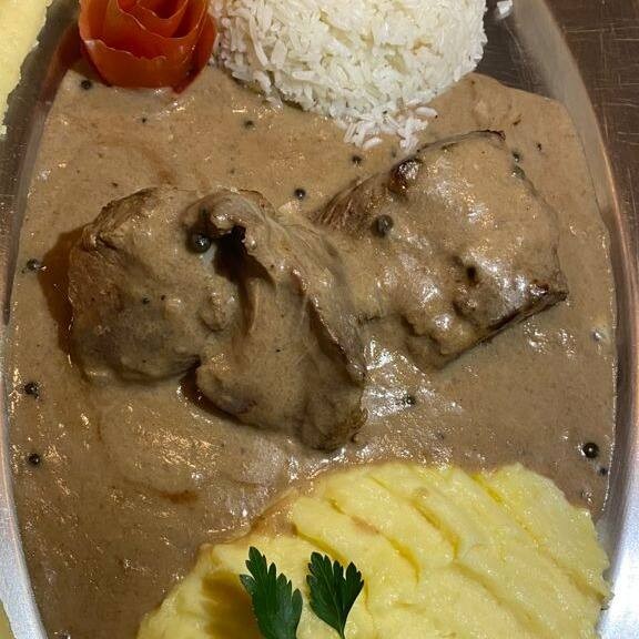 Medalhão ao molho poivre. Acompanha arroz e purê de batatas