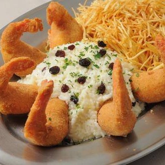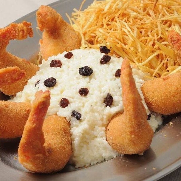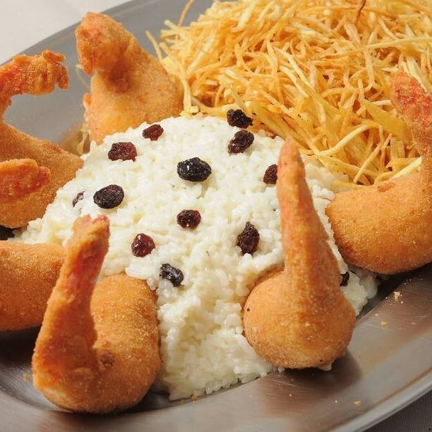 6 Camarão à milanesa recheado com Catupiry. Acompanha arroz São José e batata palha.