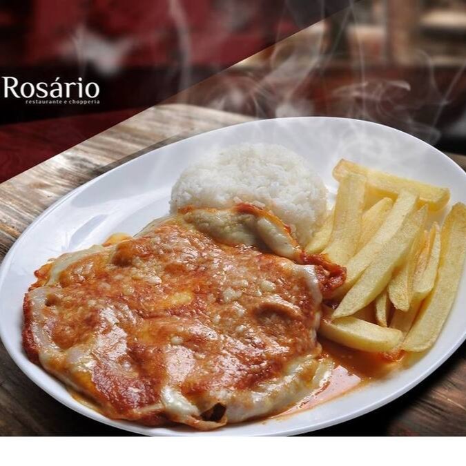 Filet mignon a milanesa com molho ao sugo, gratinado com muçarela e parmesão. Acompanha arroz e fritas