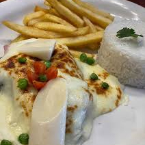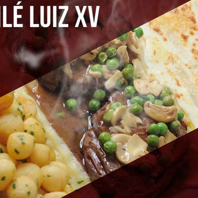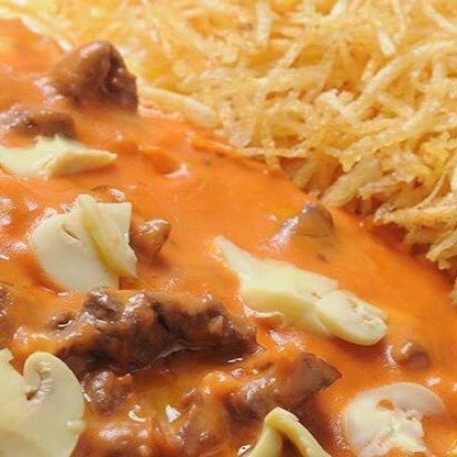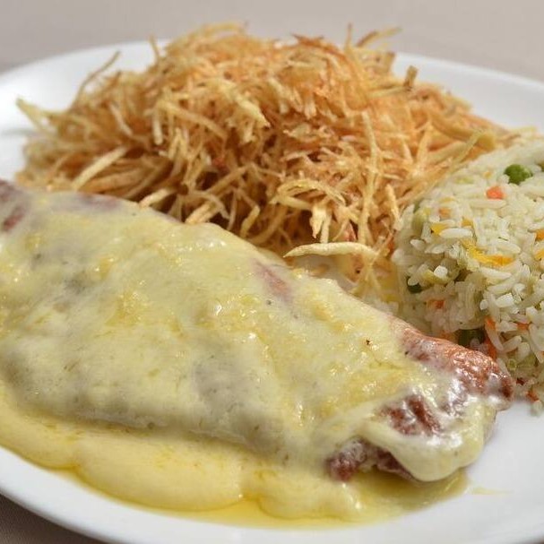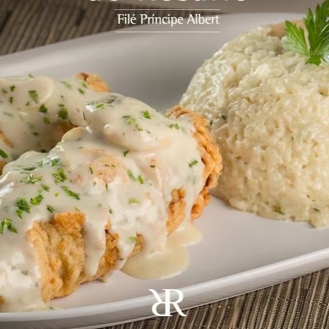 Filé mignon recheado com Catupiry à milanesa, servido ao molho branco com champignons. Acompanha arroz e batata palha